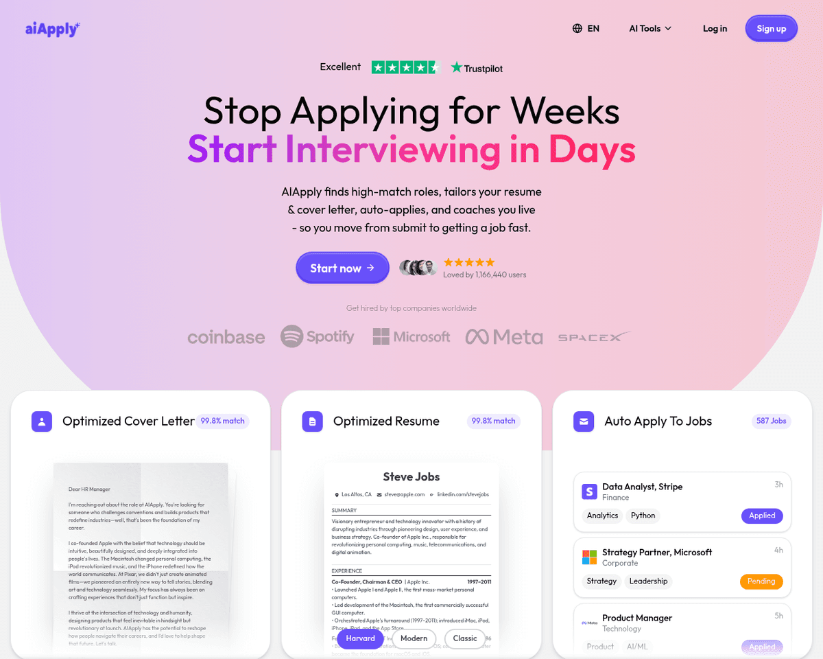 - Busy Professionals — AIApply allows busy professionals to quickly apply to multiple jobs with personalized application materials, saving them valuable time and effort in their job search.