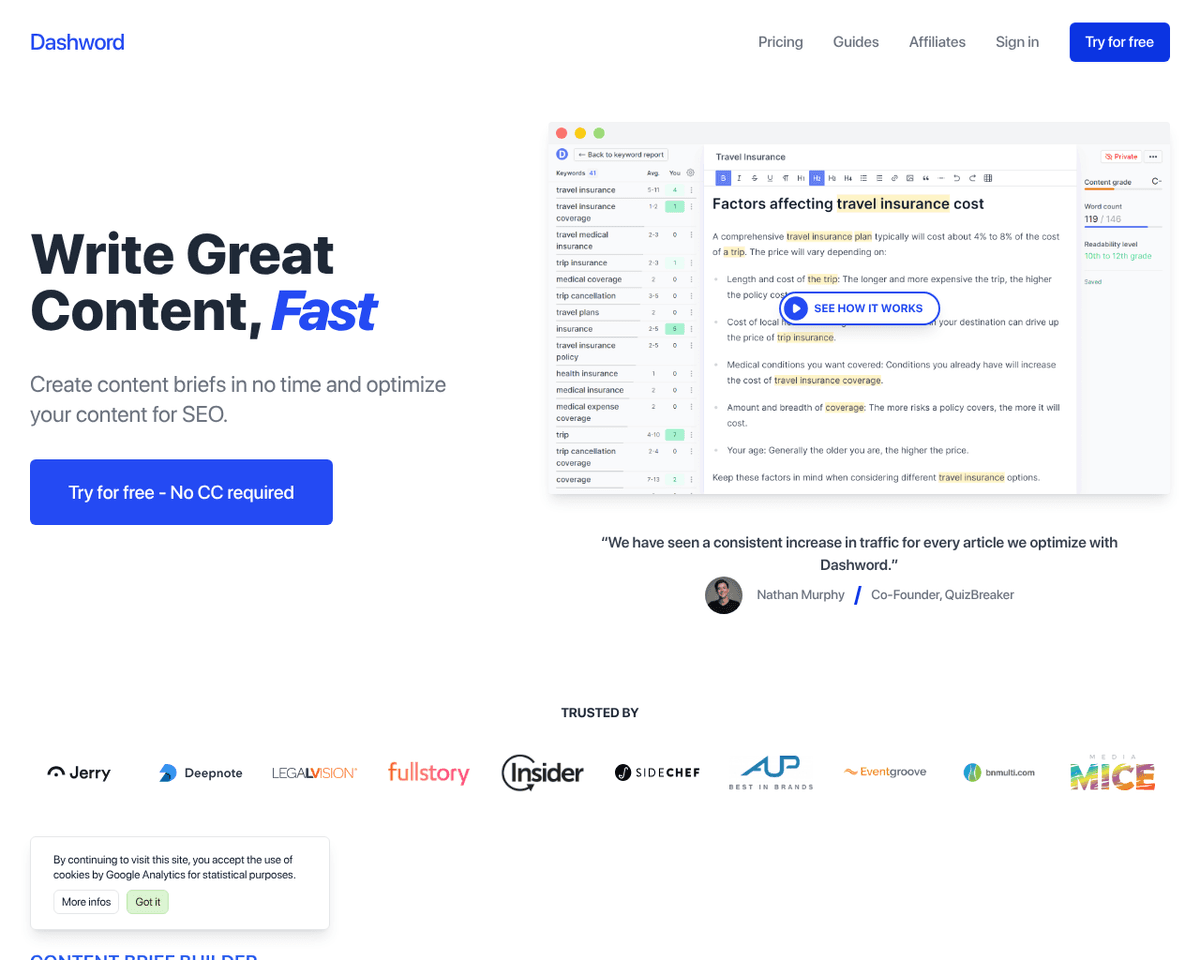 - Content Creation — Dashword helps content marketers create better briefs faster, ensuring that writers have all the resources they need to produce high-quality content that resonates with their audience.